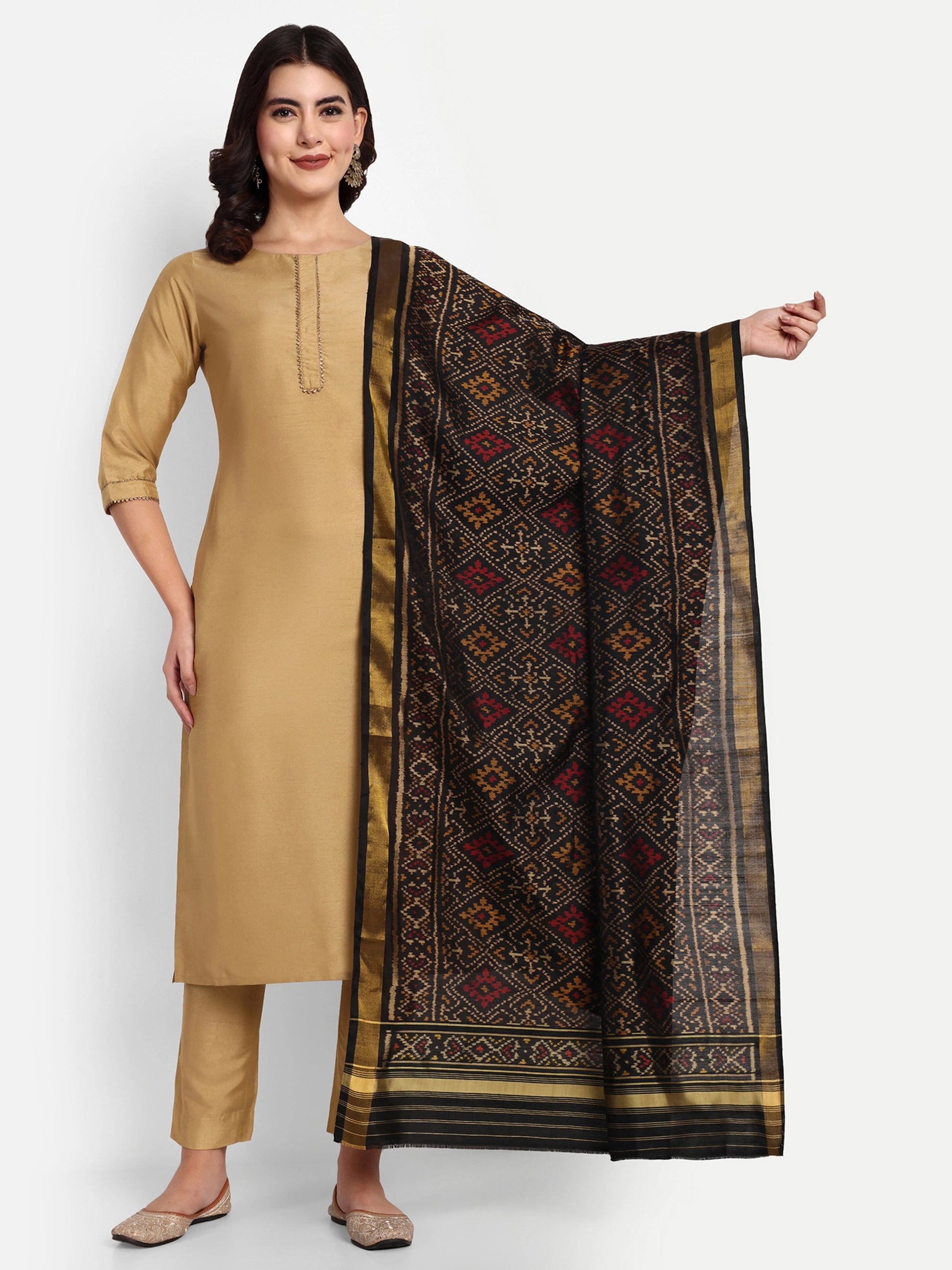 Elevate your ethnic wardrobe with this exquisite Handwoven Black Patan Patola Silk Dupatta. Featuring intricate Single ikat geometric and floral patterns, this dupatta showcases the timeless artistry of Gujarat's heritage. Crafted from pure silk, it exudes luxury and sophistication, perfect for festive and special occasions.