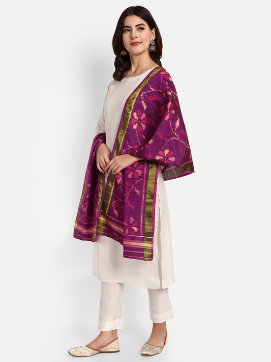 Handwoven Patan Patola Raw Silk Stole | Purple Floral Single Ikat Design